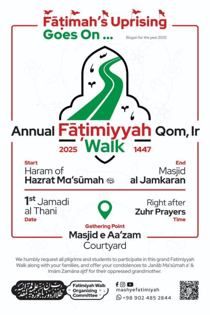 🖤🤲 With greetings and respect,and heartfelt condolences on the martyrdom of Lady Fatimah al-Zahra (sa) 🚩 Grand “Mashi Fatemi” Walk – Haram to Haram Route 📅 Saturday, November 22 / Azar 1🕰 Departure from school: 13:30🕔 Return to school: 16:30👥 For Grades 7 to 12 🚌 Bus transfer from school ➜ Pole 10🚶 Walk from […]